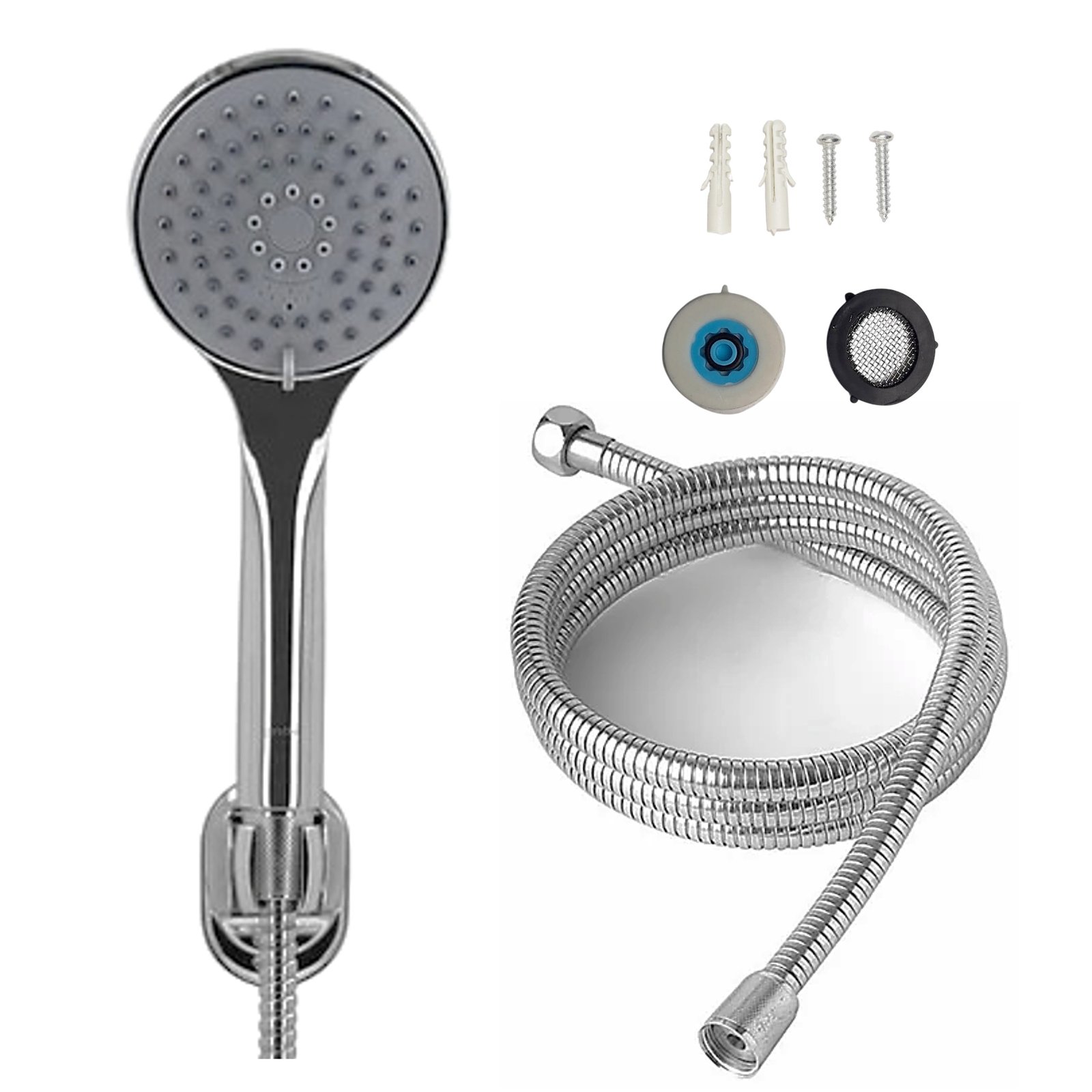 Incluye flexible de ducha de 1,5 metros de largo + Mango de ducha con conexión: 1/2» HE a flexible + Soporte de Ducha.